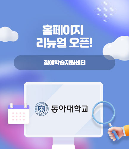 메인비주얼 DONG-A UNIVERSITY동아대학교 장애학생지원센터세계로 미래로 Pride Dong-A, 인류사회의 발전과 정의 실현에 이바지 할 수 있는 지도적 인재를 양성한다 이전 장면 1 다음 장면 정지 재생 팝업존 1 이전 장면 정지 재생 다음 장면 센터안내 보조공학기기 자유게시판 온라인상담 DAUM cafe 교수학습지원 대학생활지원 오시는 길 새로운 소식 공지사항 더보기 서식자료실 더보기 센터소개 장애학생지원센터에서는 학내 장애학생에 대한 교육복지를 향상시키기 위하여 수업 및 학교생활·취업관련 상담진행, 장애유형별 다양한 보조공학기기 지원, 장애대학생 교육지원 인력, 학습 및 평가지원, 별도의 휴식 및 학습 공간 지원 등 장애대학생들의 편리한 대학생활을 위한 다양한 지원을 실시하고 있습니다. 센터소개 바로가기 학과 유튜브 이전 장면 다음 장면 [동아를 만나다] 편견 없는 세상! 장애인식개선교육 [동아를 만나다] 편견 없는 세상! 장애인식개선교육 (통합버전) 배너모음 이전 장면 정지 재생 다음 장면